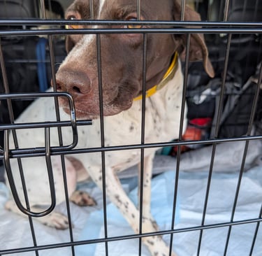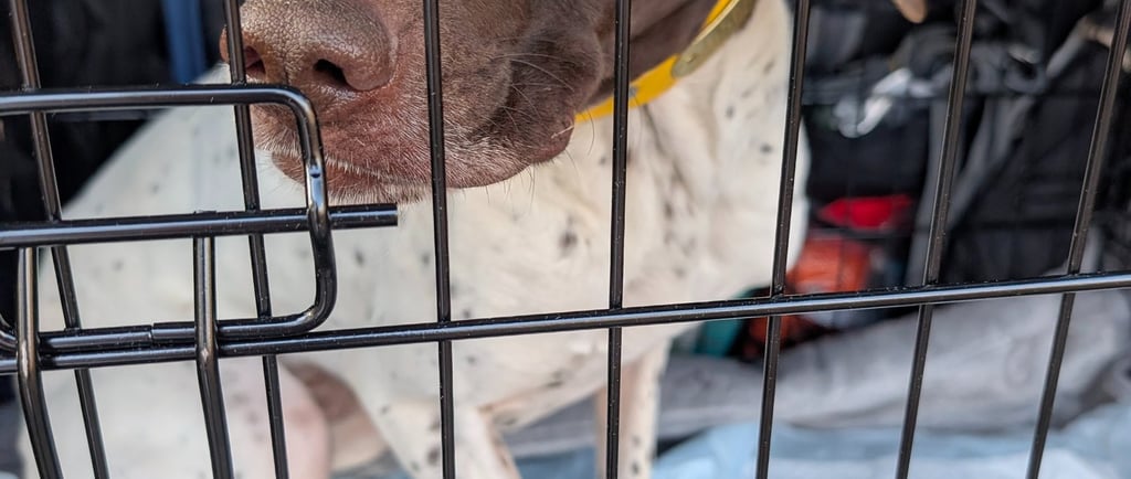 This charming hound, known for her beauty and sweet demeanor, exhibits the qualities that make her an ideal companion. Her well-behaved nature stood out throughout the ride, showcasing her remarkable training. She confidently navigated the journey alongside Wuf, a dedicated ally who ensured the comfort of both hounds during their trip. It's evident that this sweet girl possesses the qualities of a remarkable hunting dog, and her journey is just starting.